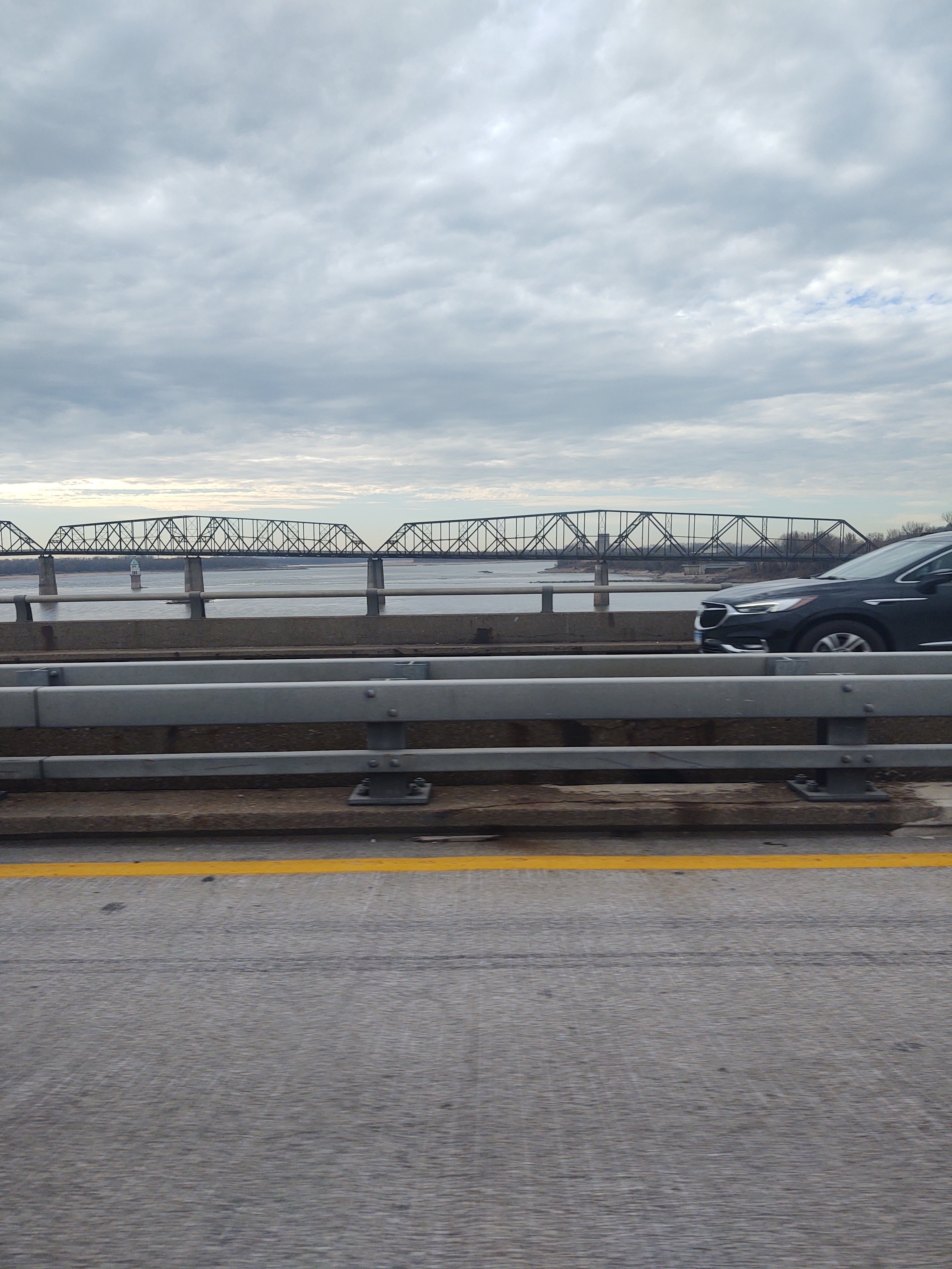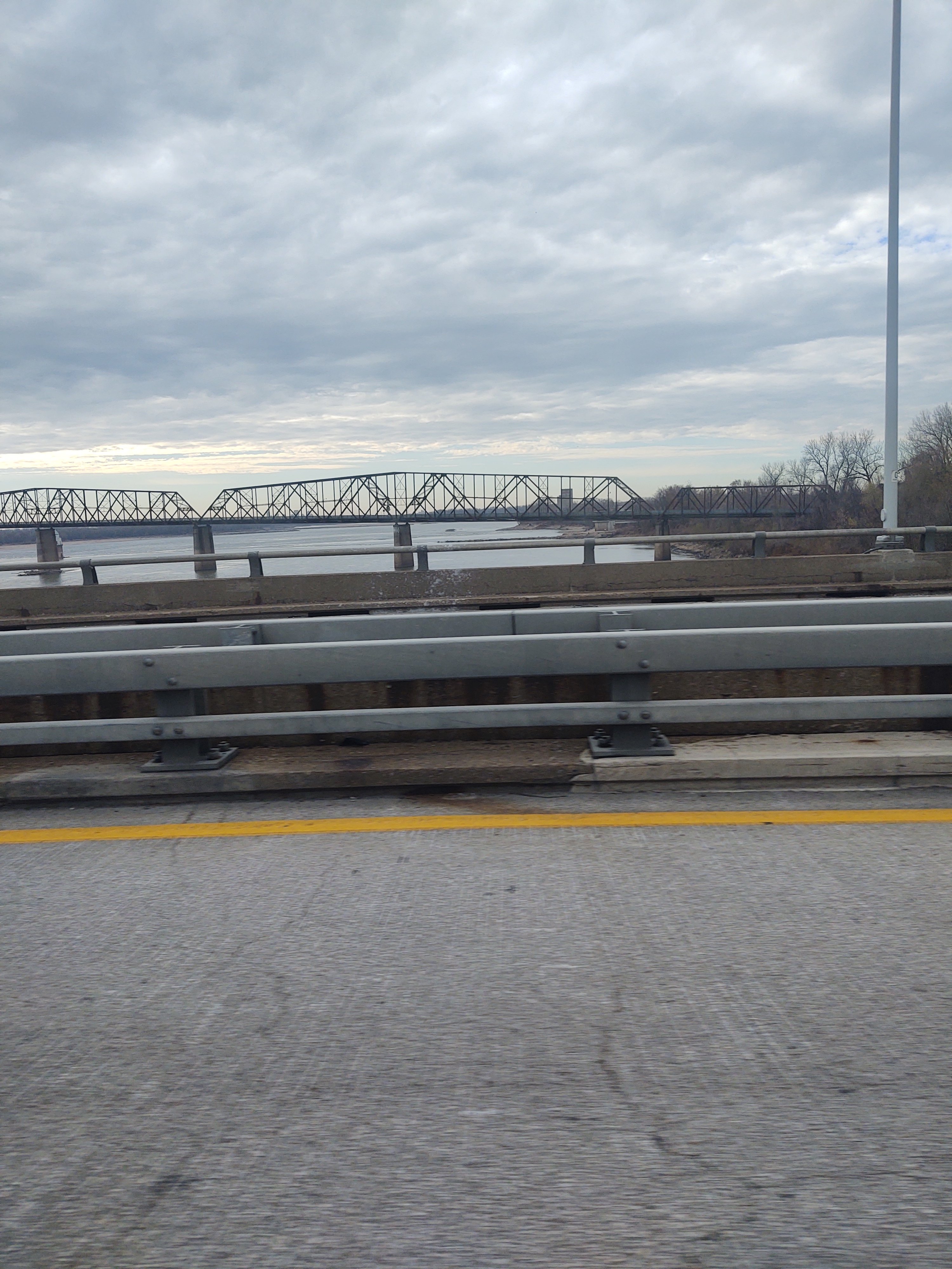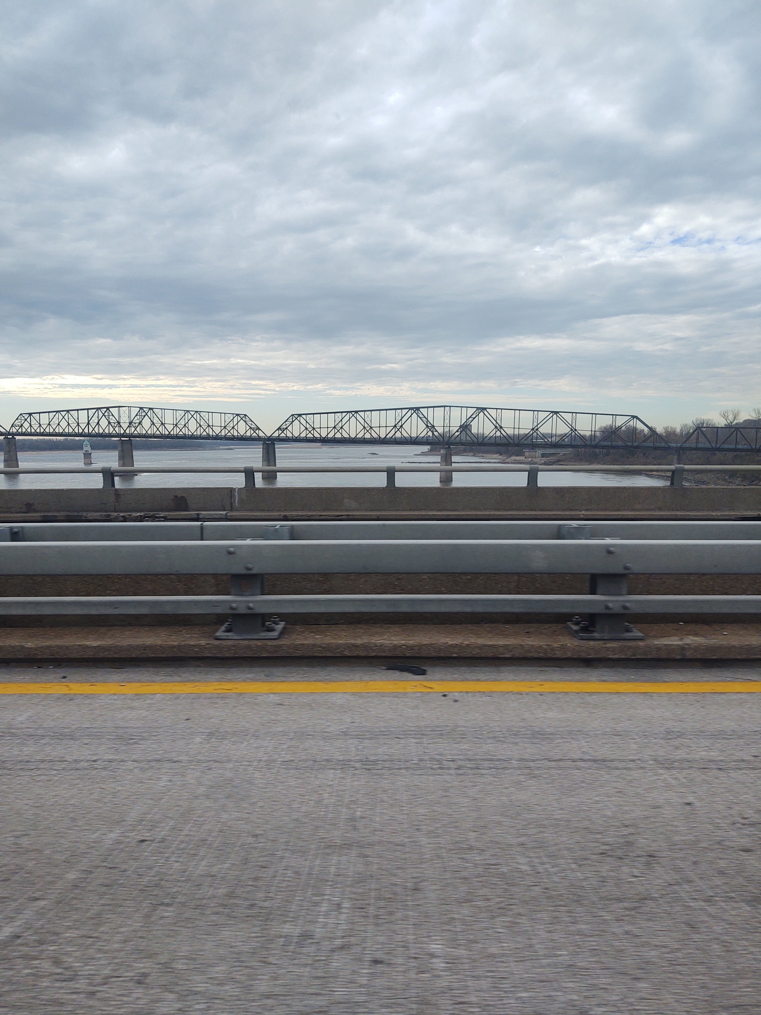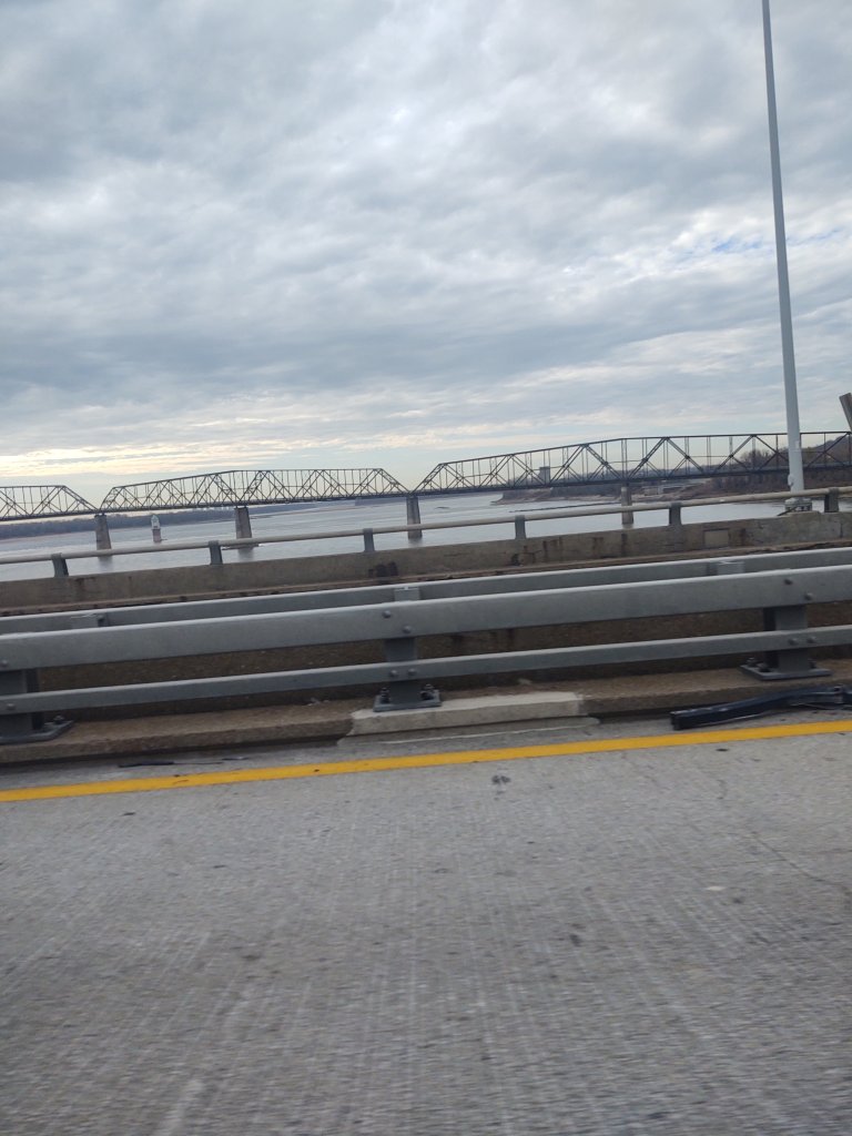 We are crossing the Mississippi River, heading West into Missouri from Illinois.